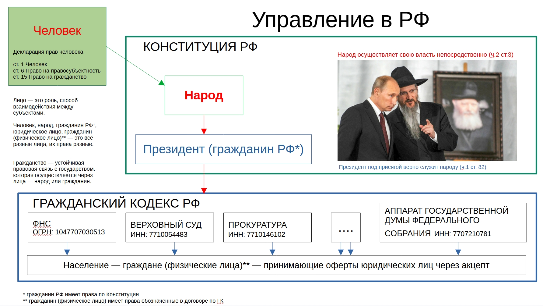 Принимая во внимание, что все юридические лица имеют названия из прописных букв, а органы государственной власти перечисленные в Конституции содержат заглавные и строчные буквы, делается обоснованный вывод, что юридические лица и органы государственной власти — это не одно и тоже. Органы государственной власти — это лица действующие на основе конституции, а юридические лица — это лица, действующие на основе гражданского кодекса. Поскольку эти юридические лица оказывают "государственные услуги", то, из определения термина "услуга", очевидно присутствие регулирования гражданским кодексом и наличие соответствующего договора. В гражданском кодексе есть только юридическое лицо и физическое лицо. При этом, в рамках гражданского закона, физическое лицо также называют гражданином. Но гражданин РФ по Конституции РФ и гражданин (физическое лицо) по Гражданскому кодексу — это совершенно разные лица, у них совершенно разные права и обязанности. Физическое лицо отсутствует в Конституции РФ, у физического лица нет никаких конституционных прав. Также физическое лицо не является ни народом, ни человеком. По ГК физическому лицу присваивается ФИО, на основании которого МВД учреждает личность с ФИО написанным прописными буквами. Поскольку ФИО присвоенное органами ЗАГС физическому лицу отличается от имени личности созданной МВД только написанием, то Паспорт гражданина РФ - удостоверение личности - ассоциируется с физическим лицом как тождество с личностью. Так или иначе, под ФИО подразумевается физическое лицо. Создание личности для физического лица и выдача "паспорта гражданина" — это тоже услуга юридического лица. Таким образом, каждый кто отождествляет себя с ФИО, признаёт себя физическим лицом без конституционных прав. В силу этих обстоятельств есть презумпция, что предъявитель паспорта — физическое лицо.